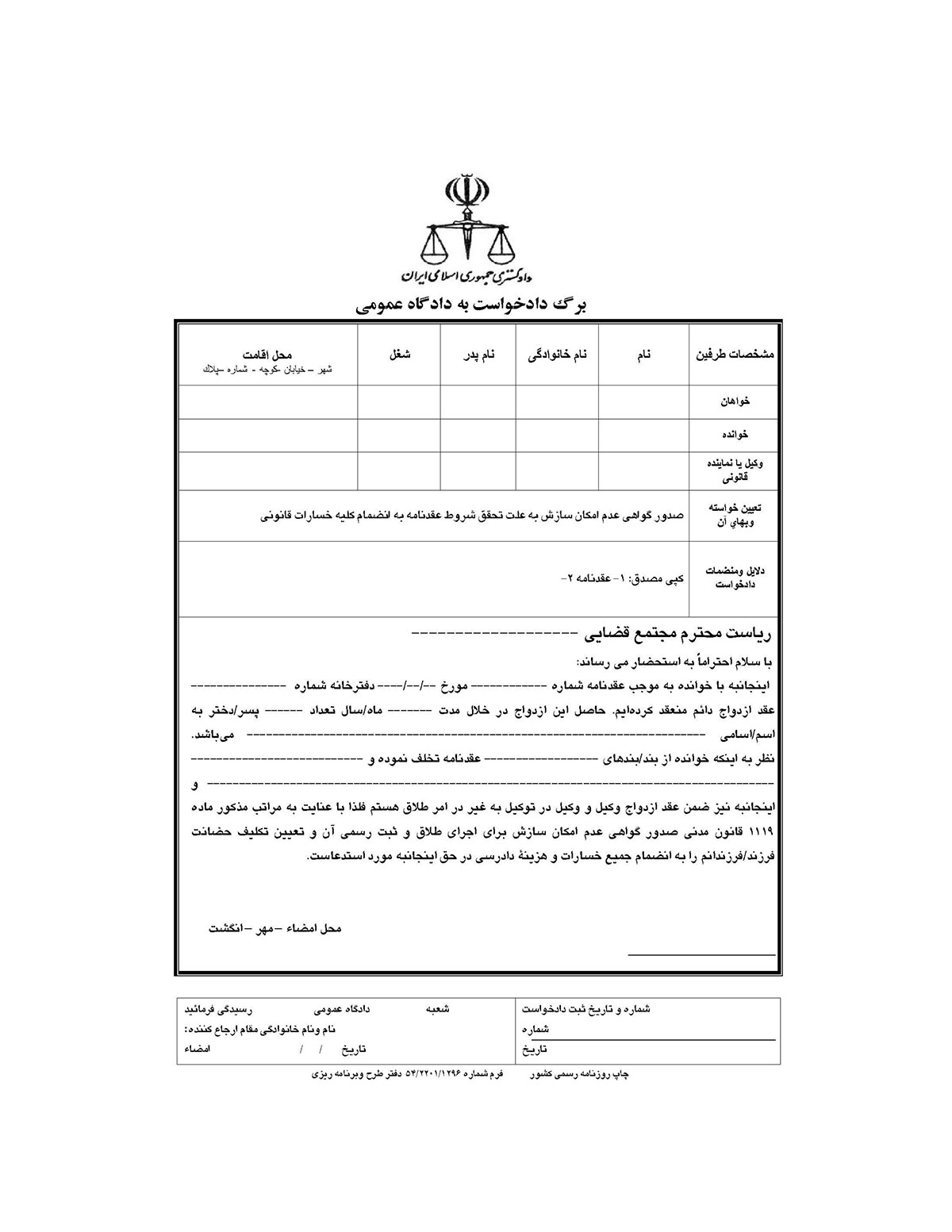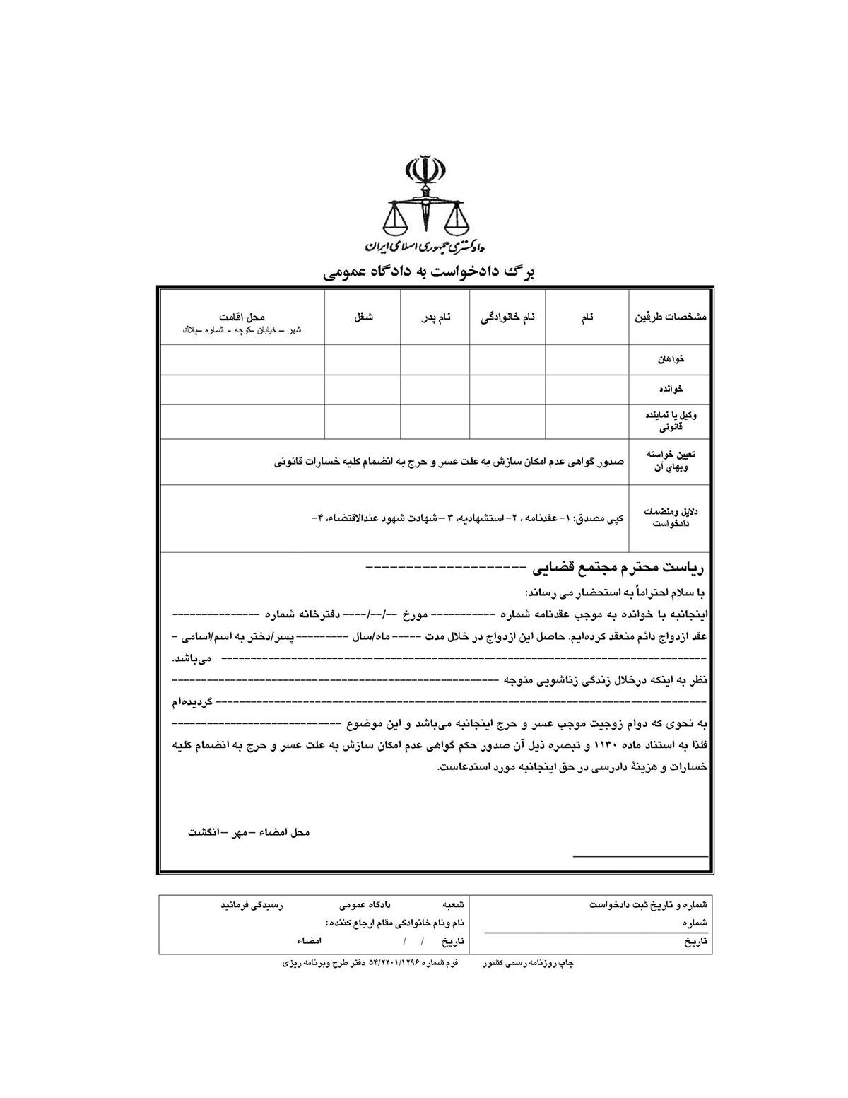 فرم دادخواست صدور گواهی عدم امكان سازش به علت عسر و حرج